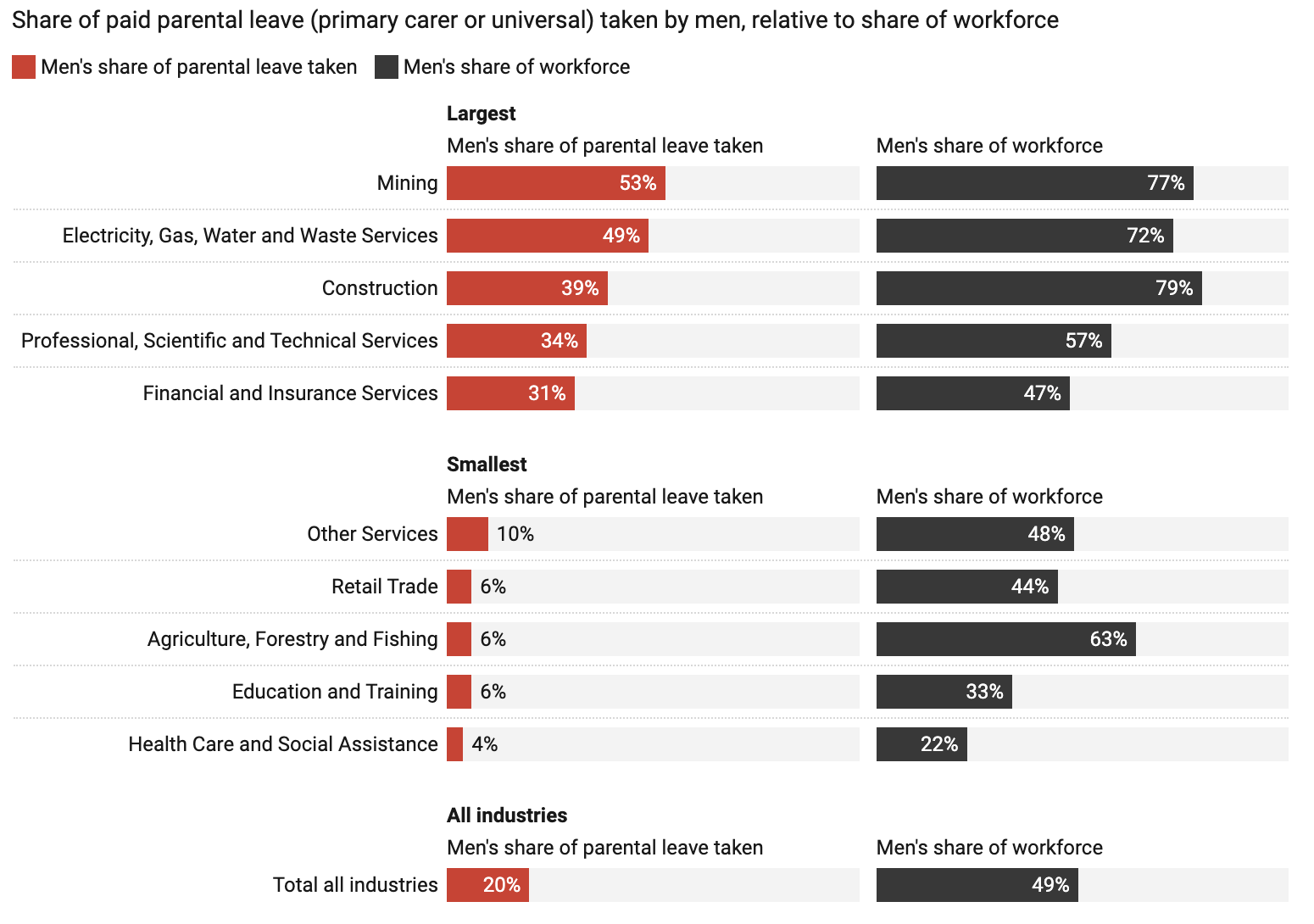 Among the industries with the biggest gaps between men’s share of the workforce and share of parental leave, men in transport, postal and warehousing take 24% of paid parental leave, despite making up 73% of the workforce.