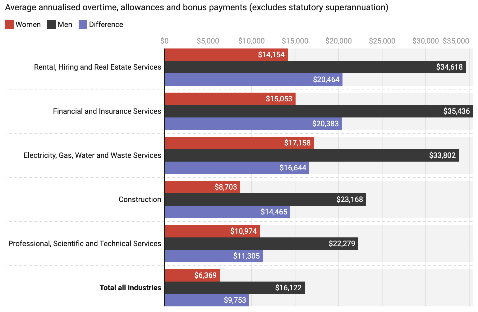 In the rental, hiring and real estate industry, these additional payments average $34,618 annually for men and $14,154 for women. That’s a gap of $20,464.